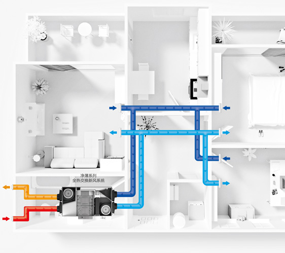 全屋新风就是能够对整个家庭空气进行通风和净化的系统,通过连通到每个房间的送风管道和排风管道,将过滤好的室外空气送到每个房间,并且将各个房间的污浊空气排出去。
