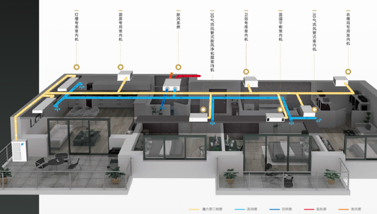 4、普通空调通常只有制冷制热的功能。而大金金制全效家用中央空调,除了冷暖以外,还能够实现温度•湿度•气流独立控制,并且厨房、卫浴、衣帽间等空间均有专用室内机对应;搭配大家家用新风系统还可实现新风引入、废气排出、室内空气净化等功能。