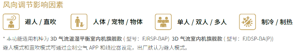本功能适用机种为3D气流温湿平衡室内机黑奢系列(型号:FJRSP-BAP)3D气流室内机黑奢系列(型号:FJDSP-BA(P)避人模式和对人直吹模式可以通过金制空气APP和线控器设定,出厂默认为避人模式。